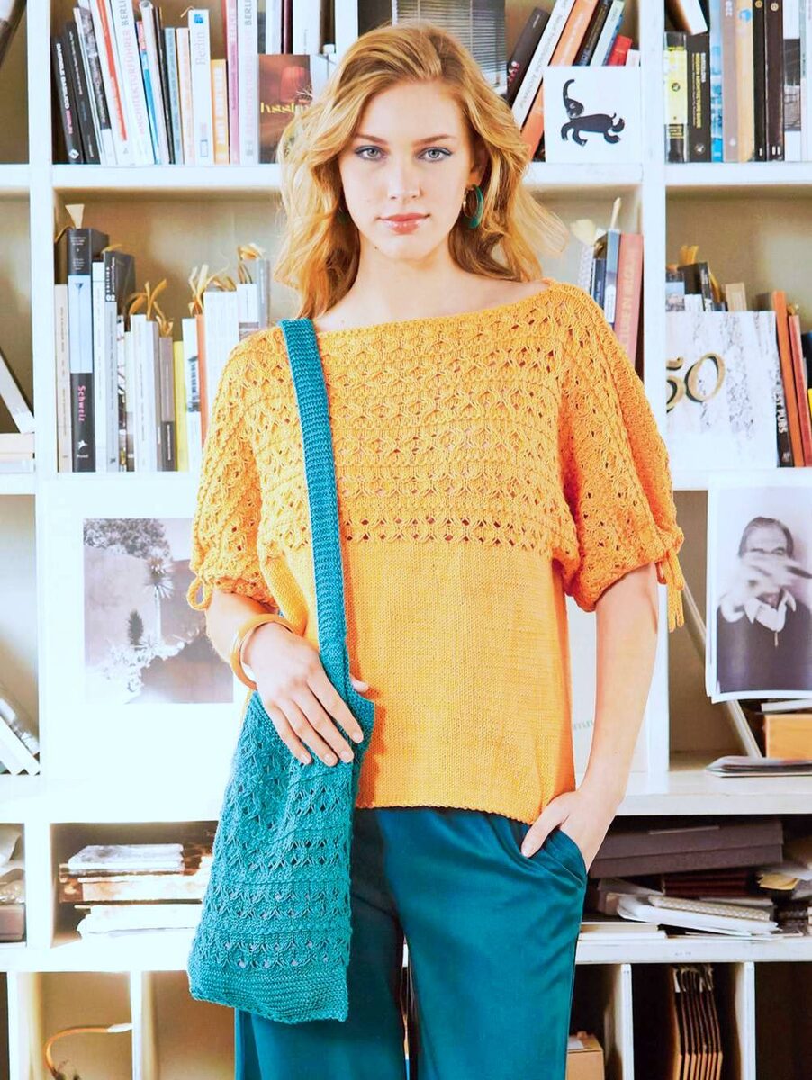 Для вязания нам потребуется 500 (550) 600 г светло-оранжевой пряжи для пуловера и 150 г изумрудной пряжи для сумки PRO LANA "Basic Cotton": 100% хлопок; 125 м/50 г.