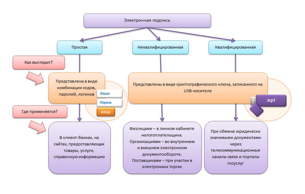 Законом «Об электронной подписи» от 06.04.2011 № 63-ФЗ установлено 3 типа ЭЦП, характеристика которых дана ниже в виде схемы: