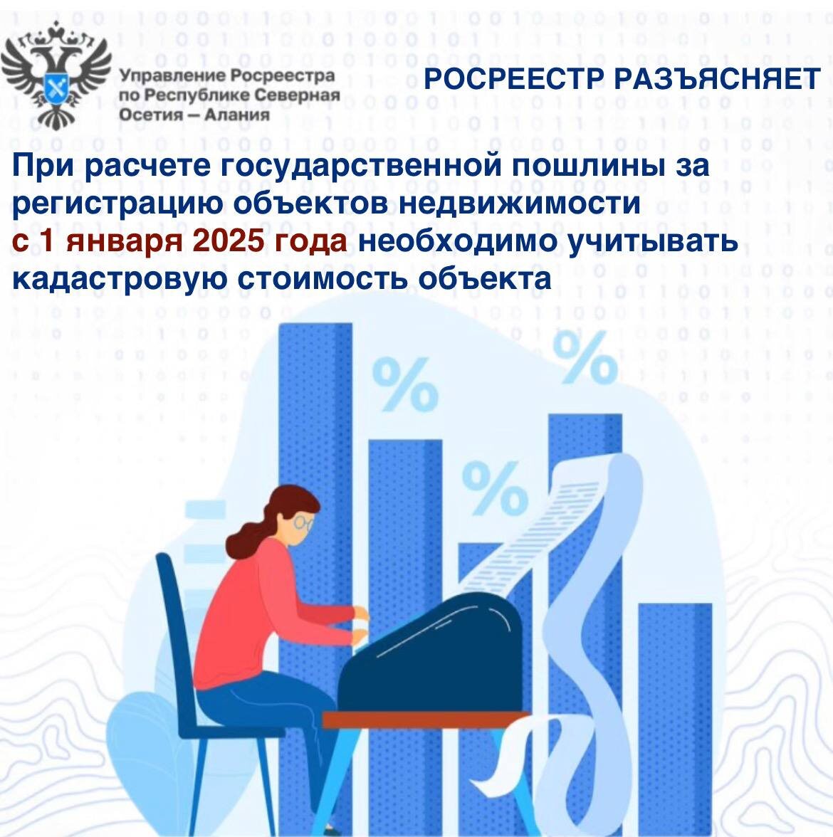 🇷🇺Получить информацию о кадастровой стоимости недвижимости быстро и просто можно через электронные сервисы сайта Росреестра – «Справочная информация по объектам недвижимости в режиме online» и геоинформационный портал «Публичная кадастровая карта» из системы «Национальная система пространственных данных». «Предварительный расчет размера госпошлины доступен на сайте Росреестра в разделе «Услуги и сервисы» через сервис «Калькулятор госпошлины»» – сообщила заместитель руководителя Управления Росреестра по Северной Осетии Алана Течиева. Для этого нужно заполнить обязательные поля: тип регистрационного действия, вид права, количество заявителей и объект недвижимости. Поля, обязательные для заполнения, отмечены звездочкой. 🗂Размер госпошлины для физических лиц: Если кадастровая стоимость не определена или не превышает 20 000 000 рублей, пошлина составляет 4 000 рублей. При стоимости свыше 20 000 000 рублей – 0,02% от кадастровой стоимости, но не более 500 000 рублей. 🏘Размер госпошлины д