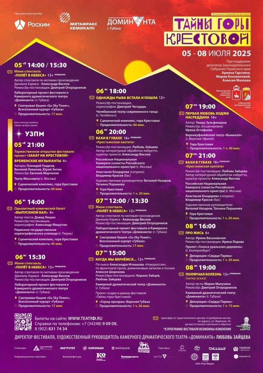 🗻🎭В эту субботу в Губахе стартует XIV Театральный ландшафтный фестиваль «Тайны горы Крестовой» Он продлится до 8 июля. Участвуют 7 театров из Губахи, Перми, Екатеринбурга, Челябинска, Верхнего Уфалея и Москвы. Среди фестивальных площадок – гора Крестовая, заброшенный шахтерский город-призрак Верхняя Губаха и декорации к фильму «Сердце Пармы». 💫Также в Башне обзора на вершине горнолыжного курорта пройдут показы мини-спектакля «Полёт в небеса», продолжительность которого всего 17 минут, именно это время заложено на подъем и спуск на смотровой башне. Каждый год Губаха передает свои живописные локации в бережное пользование театральному фестивалю. Ландшафты являются не только фоном для актерской игры, но и становятся частью сценографии спектаклей. 📸 Фестиваль «Тайны горы Крестовой» 👉 Подписаться на Своё ТВ 👉 Прислать новоость