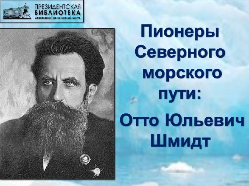К 500-летию начала освоения Россией Северного морского пути Региональный центр доступа к информационным ресурсам Президентской библиотеки имени Б. Н. Ельцина предлагает вашему вниманию видеолекторий «Пионеры Северного морского пути: Отто Юльевич Шмидт». «Во мне два человека — человек науки, ума и человек действия, воли», – говорил о себе Отто Шмидт. Оба эти человека успели совершить немало: первый писал труды по математике, разрабатывал космогоническую гипотезу о происхождении Земли, издавал Большую советскую энциклопедию. Второй совершал восхождение на Памир, руководил экспедициями в Арктику и организовывал на льдине быт челюскинцев в ожидании спасателей. Отто Юльевич Шмидт – человек неукротимой энергии и талантливый организатор, знаменитый полярный исследователь и путешественник, положивший жизнь на освоение Арктики.