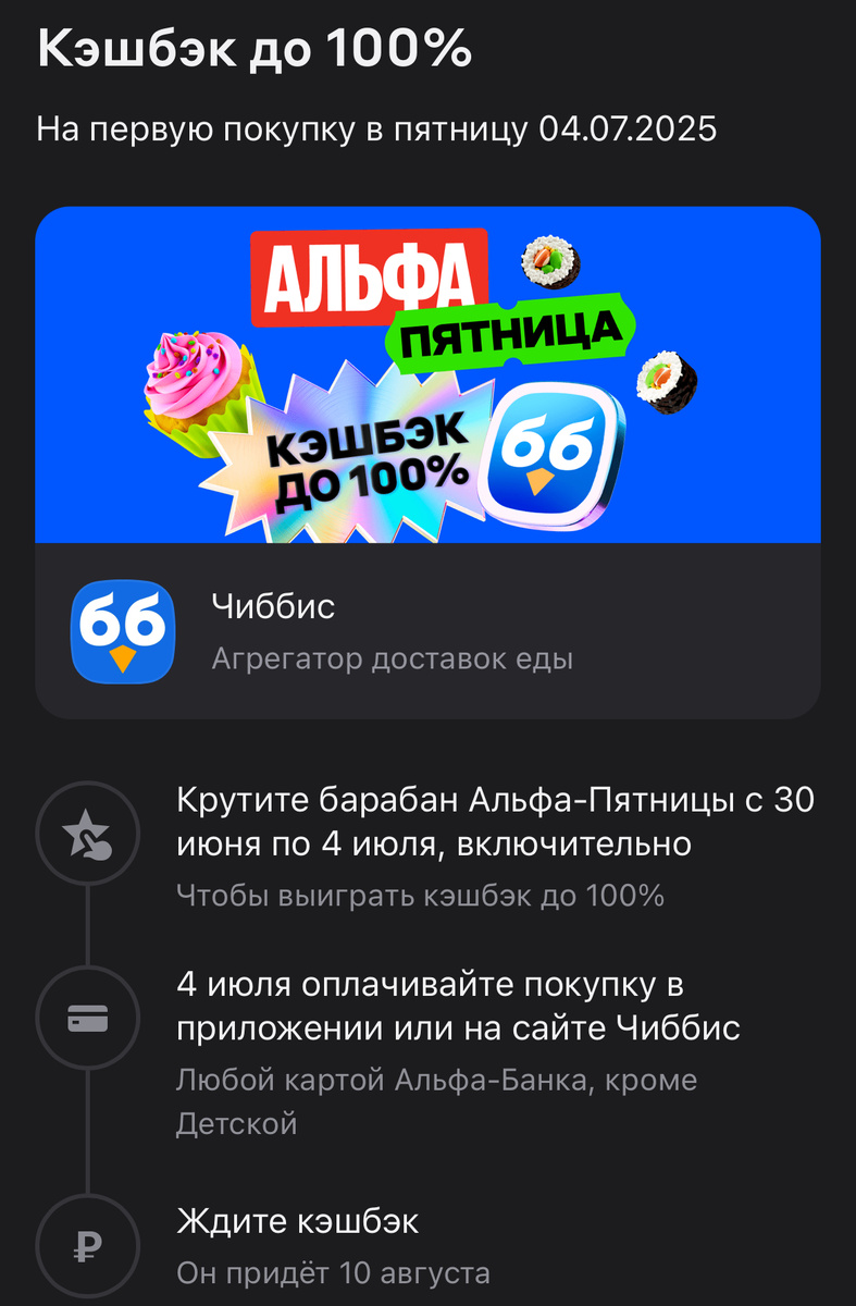 Акция с Чиббис действует сегодня до конца дня, заходите в раздел Альфа-банка «Суперкешбек до 100%», возможно сорвете куш и ваш заказ будет полностью бесплатный.