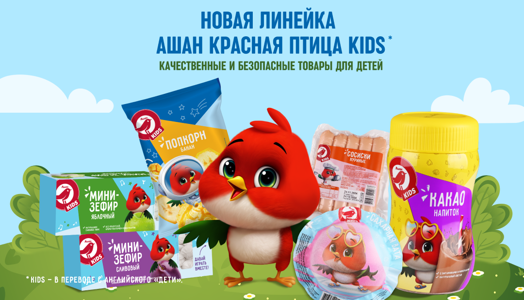 Когда речь идёт о детях, родители выбирают только лучшее. Именно поэтому мы создали АШАН Красная птица KIDS* — линейку товаров для детей от 3 лет, в которой продумано всё до мелочей. Главная особенность — наш герой, птенчик Ашаня, который присутствует на каждой упаковке. Он любопытный, добрый и немного озорной — создан, чтобы помогать ребёнку узнавать новое, учиться и играть! В ассортименте — сладости и вкусные лакомства: от печенья, воздушного зефира и качественного шоколада до ярких леденцов и любимых жевательных резинок. А ещё — аппетитные сосиски, колбаски и другие продукты с проверенным составом. Что делает линейку особенной?