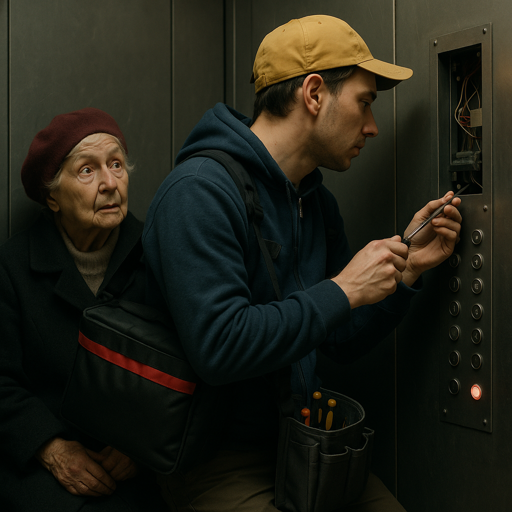 Лифт дёрнулся, щёлкнуло реле — и тихо замер между пятым и шестым этажами.