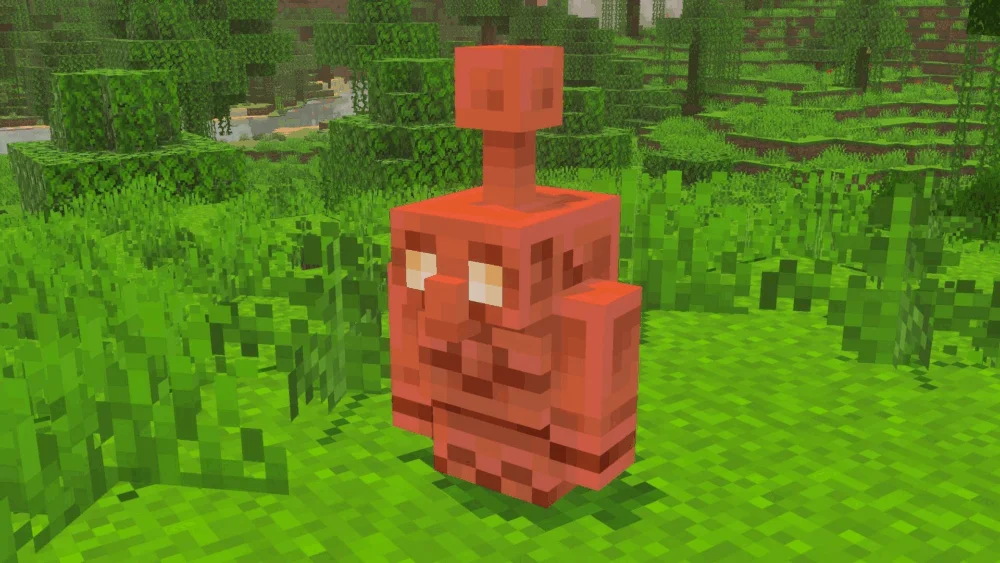 Те, кто следил за анонсами еще в 2021 году, будут приятно удивлены: внешний вид Медного Голема почти не изменился. Это небольшое создание ростом в один блок, полностью собранное из медных деталей. Его выдают ярко-желтые глаза и маленький громоотвод на голове.