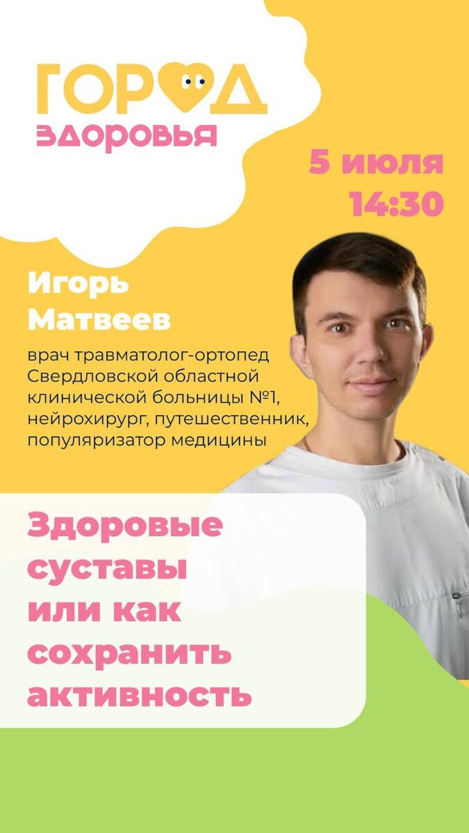 Дорогие друзья и уважаемые коллеги, выступаю завтра на Фестивале Здоровья! 5 июля в 14:30 жду всех в Парке Маяковского — расскажу, как сохранить суставы здоровыми и не терять активность с возрастом. Будет живо, полезно, без занудства и с примерами из практики. Если вы занимаетесь спортом, много двигаетесь или просто не хотите столкнуться с болью — приходите! Тема: «Здоровые суставы, или как сохранить активность» 📍 Где: Парк Маяковского 🕝 Когда: 5 июля, 14:30–15:00 Формат: Фестиваль, живая лекция, общение Приходите — буду рад встрече! Вообще завтра 5 июля с 12:00 до 20:00 в Парке Маяковского пройдет фестиваль заботы о себе «Город здоровья» Почему нельзя пропустить? Весь день — полезно и увлекательно для всей семьи! 🔬 Проверка организма – пройди медицинские обследования 🎤 Узнай новое на лекциях блогеров, психологов, спортсменов и врачей 💪 Зарядись энергией на оздоровительной пробежке и массовых тренировках с фитнес-тренерами 🌿 Порадуй себя на экозоне: участвуй в обмене растен