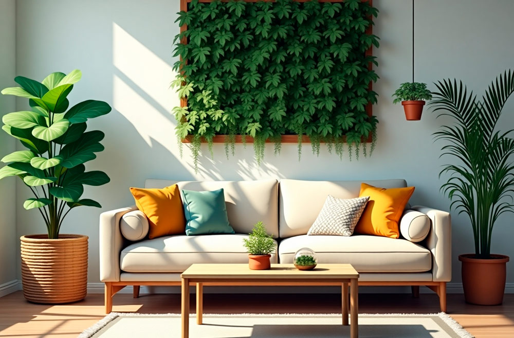 - Фитостена в гостиной — модно и воздухоочищающе.