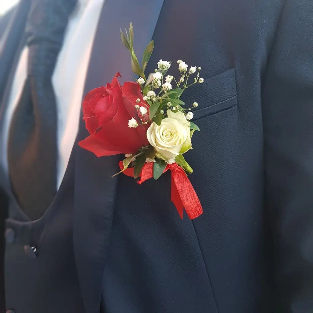 Королевский акцент для жениха: бутоньерка из алой розы и нежной гипсофилы