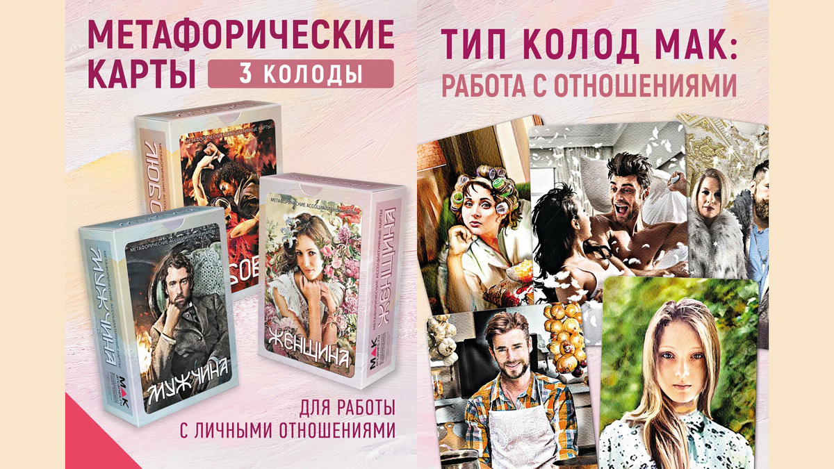Колода Мужчина-Женщина-Любовь Если вы ищете способ лучше понять себя, свои отношения или хотите добавить глубины в психологические консультации, метафорические карты "Мужчина-Женщина-Любовь" могут стать полезным инструментом. Это набор из трёх колод (Мужчина, Женщина, Любовь), каждая из которых содержит ассоциативные изображения, помогающие раскрыть внутренние переживания, страхи, желания и модели поведения в отношениях. ✔ Психологи и коучи – для работы с клиентами.