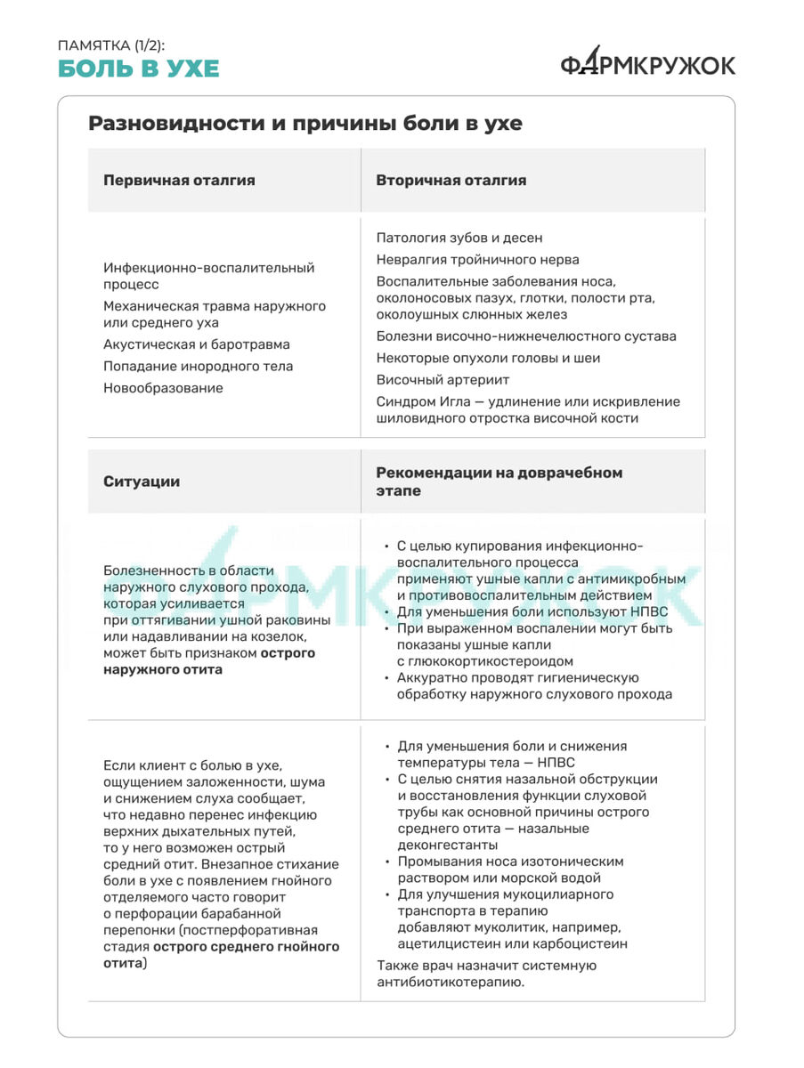 #фармгайд Ушная боль, или оталгия, бывает первичной, вызванной патологическим процессом в самом ухе, и вторичной — иррадиирующей из других областей или органов. 💊Коллеги, подготовили для вас фармгайд, в котором рассмотрели несколько типичных ситуаций и возможные рекомендации на доврачебном этапе.