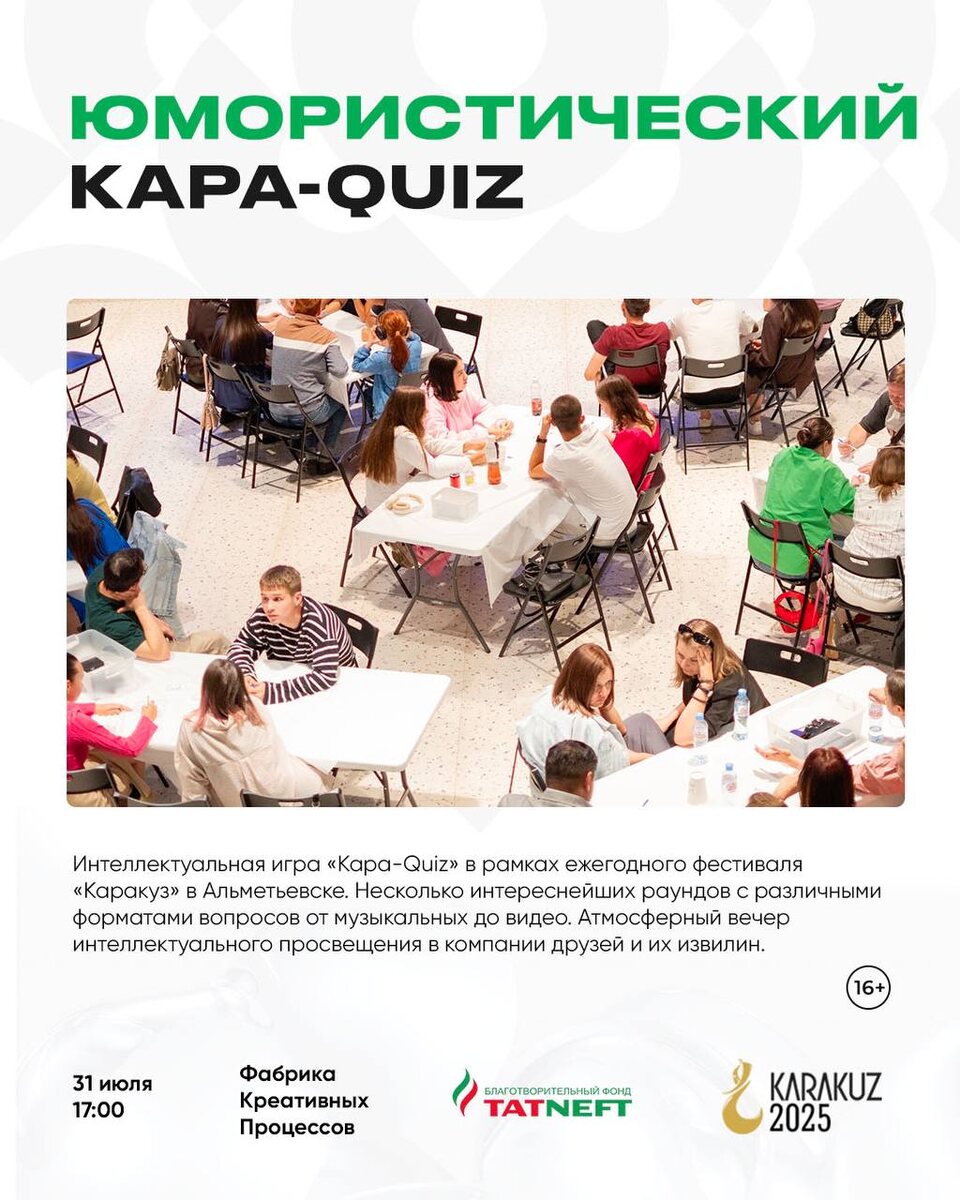 С 31 июля по 2 августа в городе Альметьевск пройдёт Юмористический уикенд в рамках фестиваля KARAKUZ❤️🔥 Знакомимся мероприятиями этого масштабного события🙌🏻 ✨Что? Юмористический КАРА-QUIZ ✨Когда? 31 июля в 17:00 ✨Где? Фабрика Креативных Процессов, ул. Ризы Фахретдина, 50 Юмористическая викторина подготовленная специально для фестиваля Karakuz-2025. Собирай команду и регистрируйся на КАРА-QUIZ. И посмеешься и пошевелишь извилинами. Сбор гостей 16:30. Вход: бесплатный. Необходима предварительная регистрация по ссылке: https://forms.gle/d3cCa165zTjRR5Xr8 Количество команд ограничено. ВОЗРАСТНОЕ ОГРАНИЧЕНИЕ 16+. Все мероприятия Юмористического уикенда можно найти здесь: https://standupkzn.ru/