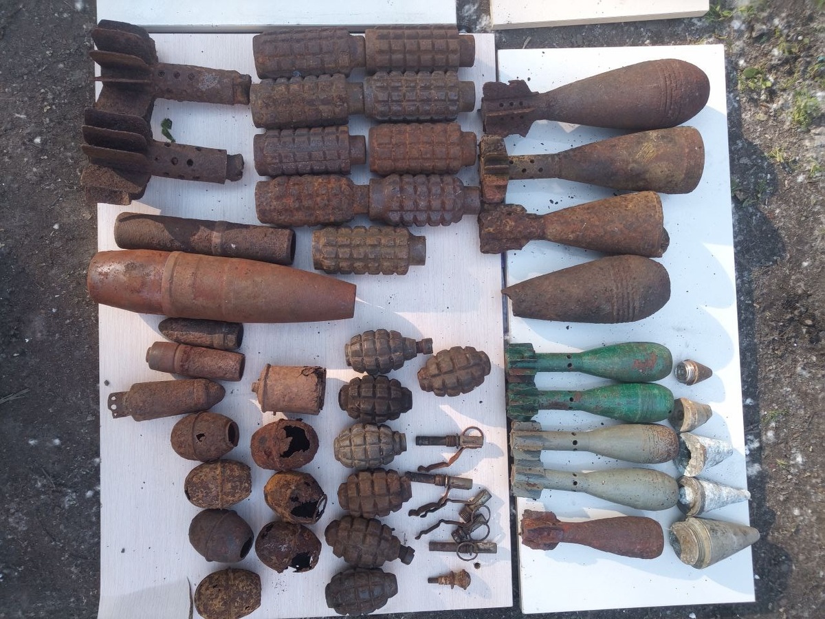 Всего в помещении находилось: 4 корпуса минометной мины калибра 82 мм, 5 корпусов минометных мин 50 мм, 9 корпусов мин ПОМЗ, 7 корпусов гранат Ф-1, 7 корпусов гранат М-39, а также корпуса артиллерийских снарядов 76 и 37 мм, хвостовые части минометных мин 120 мм, корпуса гранаты М-24 и корпус ружейной надкалиберной гранаты, и др. Указанные предметы направлены на утилизацию.
