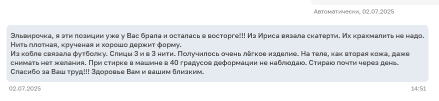 Доброго вечера всем читающим!!! Недавно мне прилетел заказ, и, поскольку я задерживаю с его отправкой, мы немного переписывались с покупательницей. И она оставила отзыв о двух артикулах моего магазина. А что может быть лучше рекомендации от имени покупателя? Я оставлю скрин для «Фомы неверующего». Итак первый артикул - ссылка активна И второй - ссылка активна Присмотритесь, девочки, эти два артикула многим нравятся. Одна из покупательниц берет ирис на воротнички для школьных платьев, тоже говорит, лучше не бывает. Много что пробовала. А я покажу немного продвижений девочек в конкурсе ШТОРЫ и СКАТЕРТИ Есть уже и готовые работы. Следите за публикациями. Каждая работа будет с описанием пряжи, расхода, инструмента и размера готового изделия. Приятного вечера пятницы, всем добра!!!