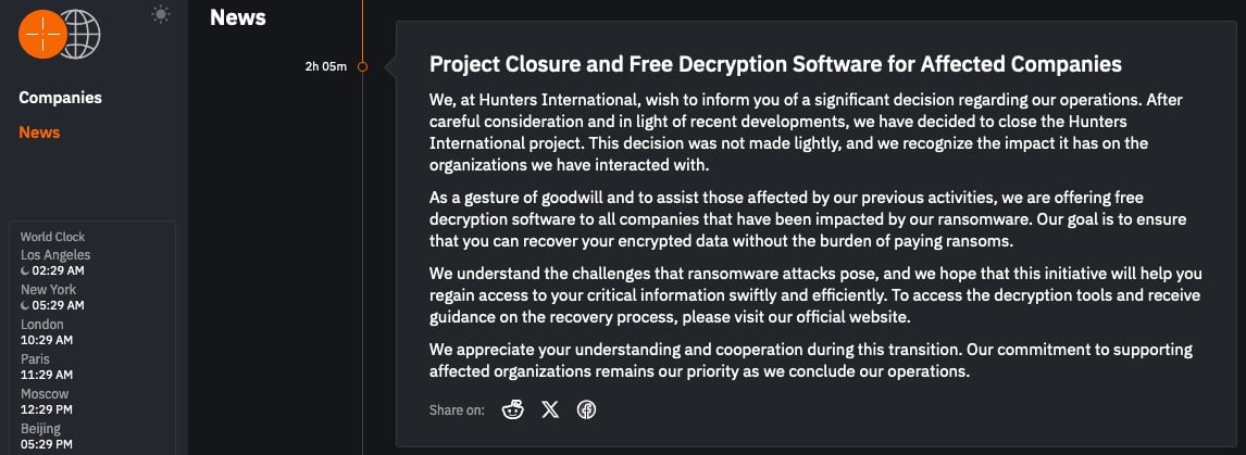 #news Hunters International завершила деятельность