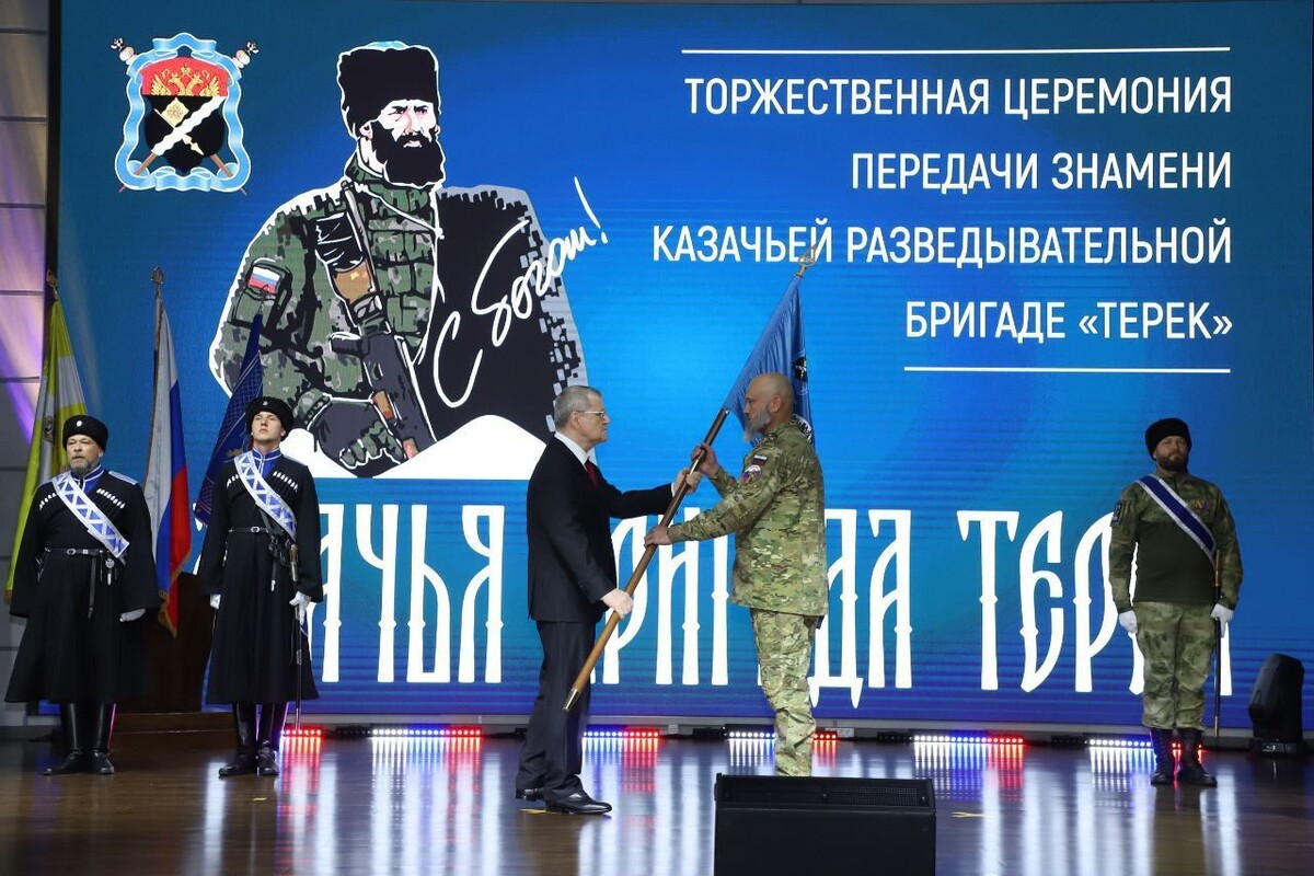 Казачьей разведывательной бригаде «Терек» в Пятигорске торжественно передали знамя с личной подписью и напутствием президента России Владимира Путина. Об этом сообщили в упралении пресс-службы и информполитики ГСК и ПСК. В церемонии приняли участие полпред президента РФ в СКФО Юрий Чайка, губернатор Ставропольского края Владимир Владимиров, главы Кабардино-Балкарии, Карачаево-Черкесии и Северной Осетии-Алании, а также атаман Всероссийского казачьего общества Виталий Кузнецов. Знамя получил командир бригады Михаил Гаджиев. Юрий Чайка отметил, что глава государства оказал терцам и всем добровольческим казачьим формированиям огромную честь, зная о заслугах бойцов, их бесстрашии и преданности Отчизне. «В составе бригады в одном строю, ежедневно демонстрируя несгибаемую волю, силу духа, мужество и отвагу, стоят более двух тысяч представителей разных национальностей и конфессий. Под своим Знаменем бригада Терек объединила несколько батальонов — Терек, Скиф, Каспий, Балтика, Гребенской, артил