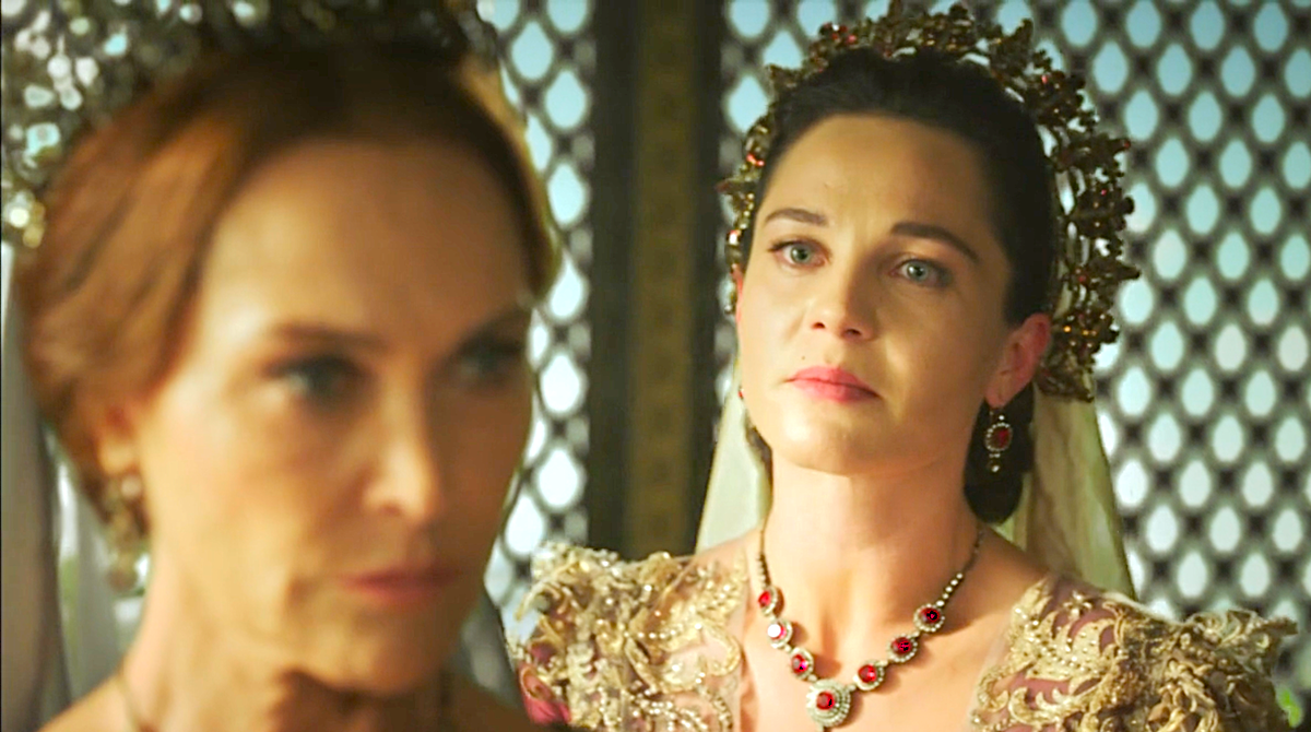 Какая из Валиде первой поедет во дворец слёз? Каждая из двух могущественных дам Османской империи мечтает править в султанском дворце одной. У Султана Ахмеда определённо хотят отобрать трон. Но также идёт и борьба за влияние в гареме Ахмеда. Ведь именно Валиде руководит гаремом. А здесь их образовалось две: мать и бабушка падишаха. Старшая Валиде, Сафие Султан, оценивает ум невестки невысоко и насмешливо называет её "Хасеки с родинкой". Забавно, не правда ли? Сафие трудно назвать бабушкой. И юмор у неё оригинальный. Заметьте, здесь "Хасеки" для Хандан звучит в унизительном варианте. Конечно же "Хасеки" по статусу ниже "Валиде". А Хандан здесь действительно с родинкой. Помню, она казалась мне очень красивой. Хотя тут столько уникальных личностей, что трудно сказать, кто из них более колоритный. Без сильного характера даже самая прекрасная дама не будет выглядеть интересней мудрой и яркой особы. На этот раз у Сафие Султан не получилось выторговать себе дальнейшее пребывание в султанск