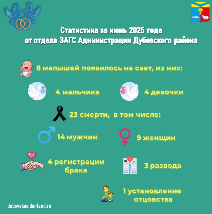 В июне 2025 года в отделе ЗАГС Администрации Дубовского района Ростовской области зарегистрировали 43 акта гражданского состояния: - 8 рождений: в трех семьях появился первый ребенок, в двух — второй, в одной — третий, в одной — четвертый, в одной — пятый. - 23 смертей: 14 мужчин и 9 женщин. - 4 регистрации брака. - 3 развода. - 4 случая установления отцовства. #статистика #ЗАГС #ДубовскийрайонРостовскаяобласть #демография