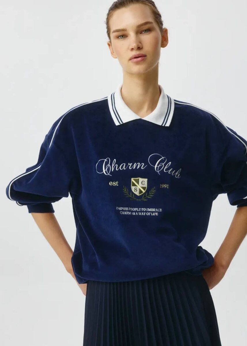 Потрясающий свитшот в стиле преппи нашла в SELA Свинка С контрастным белым воротником из велюра глубокого синего цвета Сочетается достаточно просто и очень красиво будет смотреться с короткой юбкой, белыми носочками и лоферами