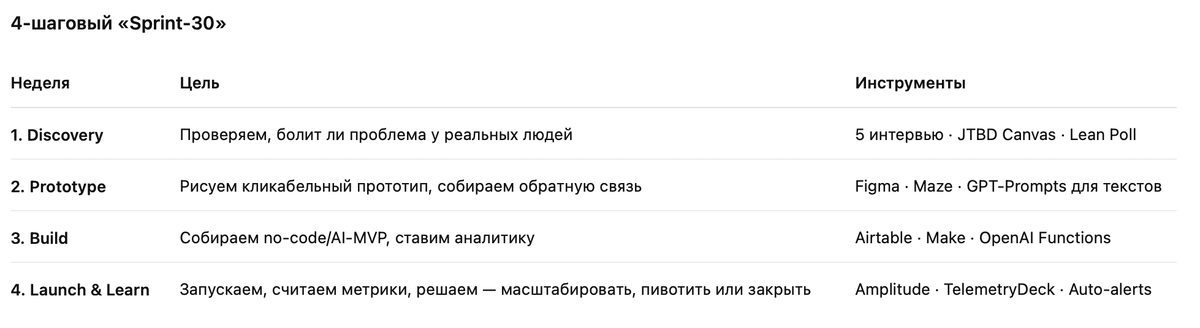У каждого владельца IT-бизнеса или тех-предпринимателя в голове лежит пачка идей: «а если запустим новый модуль?…», «а вдруг marketplace?..». Проблема одна — идеи тонут в хаосе: не хватает чёткого процесса, опыта product-развития и времени, чтобы всё протестировать. Цель канала — дать готовую «конвейерную ленту», где идея за 30 дней превращается в работающий MVP и первые рубли выручки, а не в бесконечный «когда-нибудь». От идеи к первому рублю — 30 дней. Пора проверить, сколько стоит ваша следующая гипотеза.