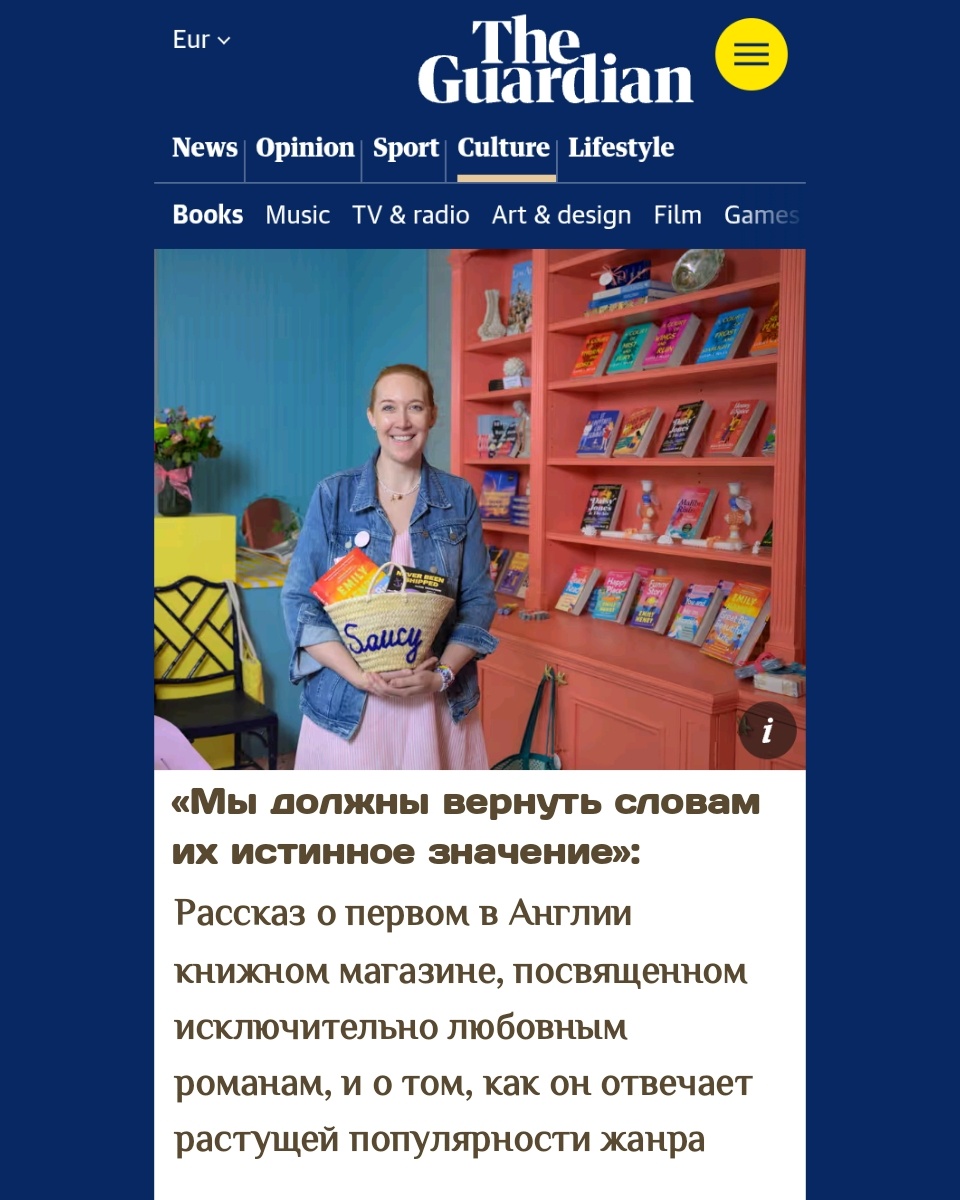 В The Guardian вышла забавная статья о том, как романтическая литература перестаёт быть чем-то постыдным и превращается в полноценный культурный и коммерческий феномен. В Лондоне открылся «Saucy Books» — первый в Англии книжный магазин, который торгует исключительно романами. Он отражает стремительный рост интереса к жанру, особенно среди молодых женщин, аудитории TikTok и тех, кто устал от литературной «серьёзности». Интерьер в стиле розовой мечты буктьюберов, атмосфера — как бывает в книжных клубах после второго бокала. • Сюжеты здесь часто переплетаются с фэнтези, детективом и социальными темами — в моде поджанры ром-фант (romantasy), темная академия (dark academia), горячая любовь (spicy romance) и др. На розовых полках — подборки вроде «Принцы, ведьмы и похищения» или «Любовь в магическом средневековье». Проводятся встречи читателей, романтические клубы и мини-фестивали. • Немного цифр: – в 2024 году продажи романов в Великобритании достигли £69 млн – общий объём художествен