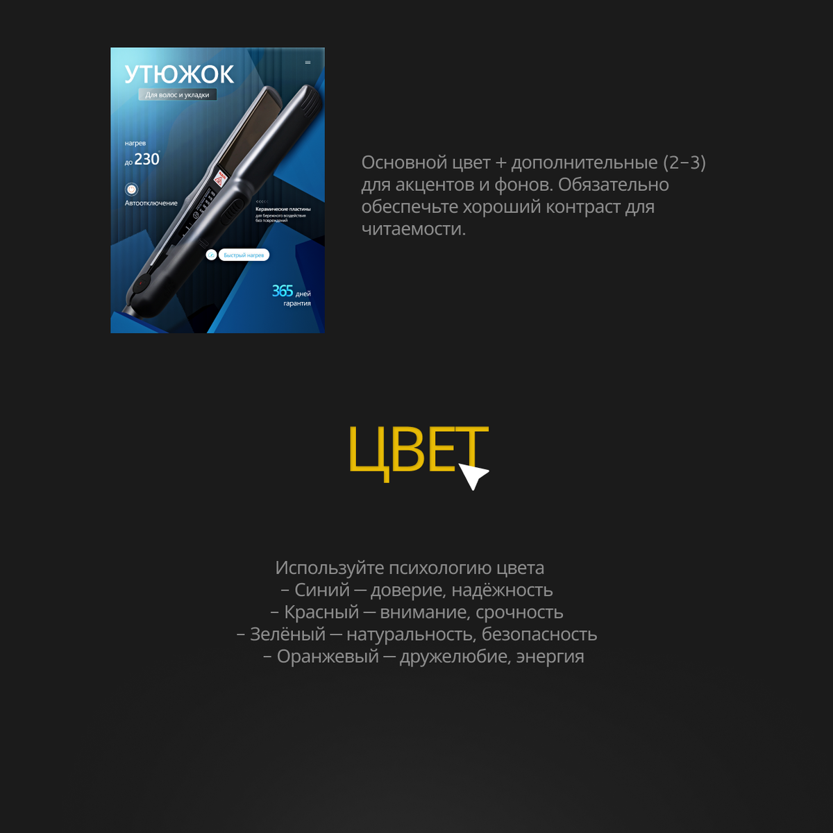Создание эффективного дизайна для маркетплейсов — это не просто красивая картинка, а инструмент, который помогает увеличить продажи и привлечь внимание покупателя. Важнейшими элементами такого дизайна являются цвета и текст. Рассмотрим, как правильно их подбирать. Цвета и их влияние на восприятие 1. Психология цвета Цвета несут эмоциональный заряд и могут мотивировать к покупке. Например: - Красный — вызывает чувство срочности, подходит для акций и скидок. - Синий — ассоциируется с надежностью и безопасностью, хорош для техники и финансовых товаров. - Зеленый — символ природы и здоровья, отлично подходит для эко-продуктов. - Желтый и оранжевый — привлекают внимание и создают ощущение тепла. 2. Целевая аудитория Учитывайте предпочтения и характер вашей аудитории. Молодежи подойдут яркие и контрастные цвета, а для более зрелой аудитории лучше использовать спокойные, мягкие тона. 3. Контрастность и читаемость Цвет текста должен контрастировать с фоном, чтобы информация легко читалась.
