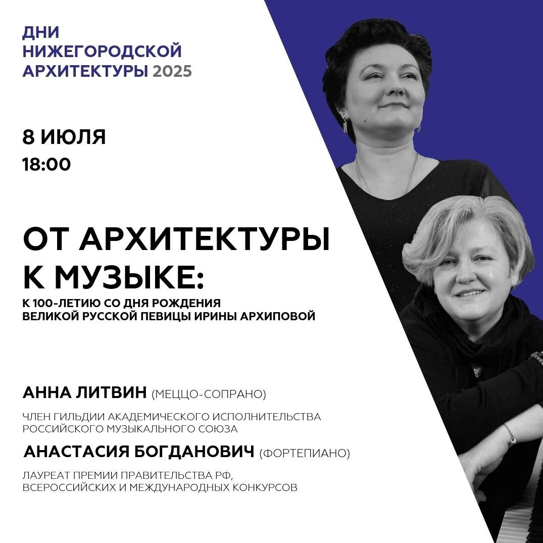 Концерт, посвящённый выдающей российской оперной певице — Ирине Архиповой. Блестящая карьера певицы началась с вокального кружка в МАРХИ, который она закончила в послевоенные годы, а с 1955 года она выступала на лучших мировых сценах. С классическим репертуаром Архиповой для вас выступят: 🔸 АННА ЛИТВИН (меццо-сопрано) — член гильдии академического исполнительства Российского музыкального союза, лауреат Всероссийских и международных конкурсов, старший преподаватель Нижегородской государственной консерватории им. М.И. Глинки 🔸 АНАСТАСИЯ БОГДАНОВИЧ (фортепиано) — лауреат премии Правительства РФ, обладатель медали «Наше наследие» имени Г.В. Свиридова, лауреат Всероссийских и международных конкурсов КОГДА: 8 июля (вт) — 18:00 ГДЕ: Верхне-Волжская набережная, дом 2 ✍️ РЕГИСТРАЦИЯ: clck.ru/3Mv7nV 😄 Мероприятия Нижний Новгород. Я местный!