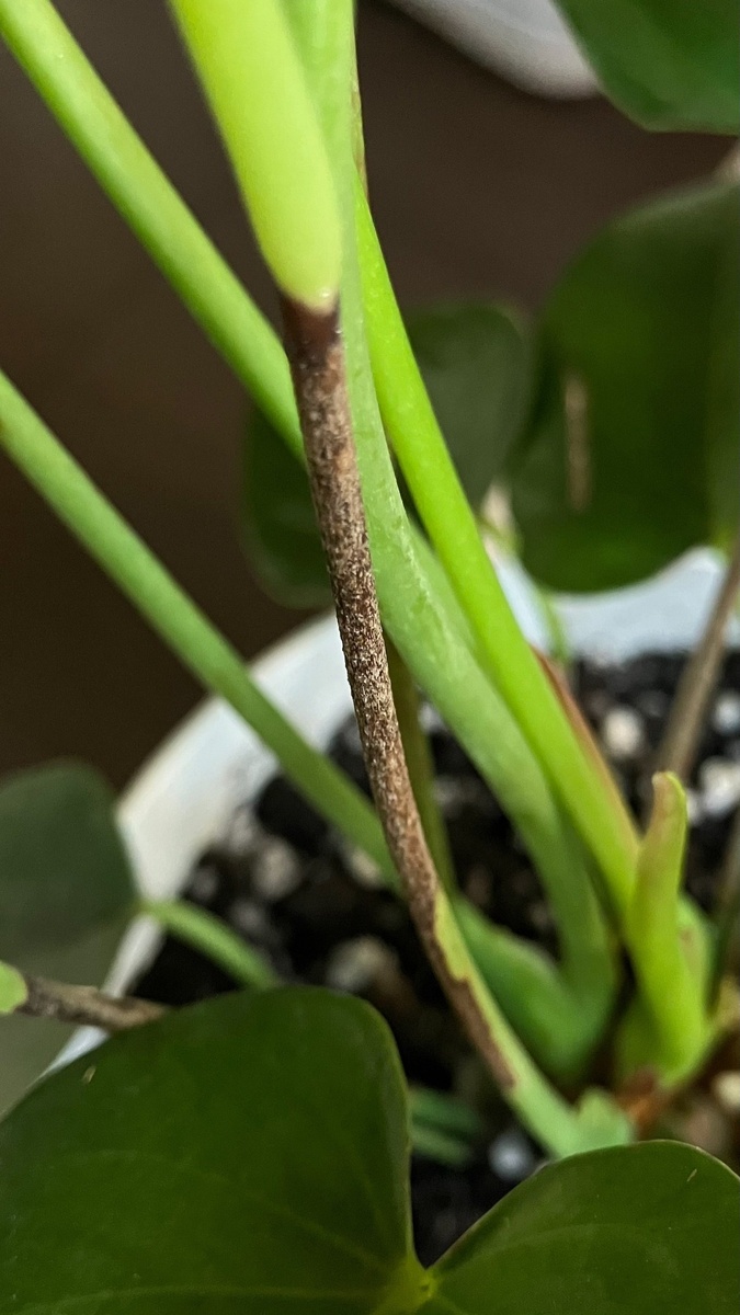 Здравствуйте! Подскажите пожалуйста, что это за ситуация такая с антуриумом? Некоторые стебли имеют такие вот сухие части. Растение забрала у мамы, когда ее не стало. Она его купила где-то месяца два назад, рос он у нее в транспортировочном горшке, были заливы сильные, плюс все время открыто окно. Возможно сквозняки. Когда я его забрала, сразу же пересадила. Корни чудесные, крепкие. Но стебли уже были такие. Впервые с таким сталкиваюсь, в интернете информацию не нашла. Сейчас он цветет. С листьями тоже ситуация отличная. Если это какое-то заболевание, то как с ним бороться?