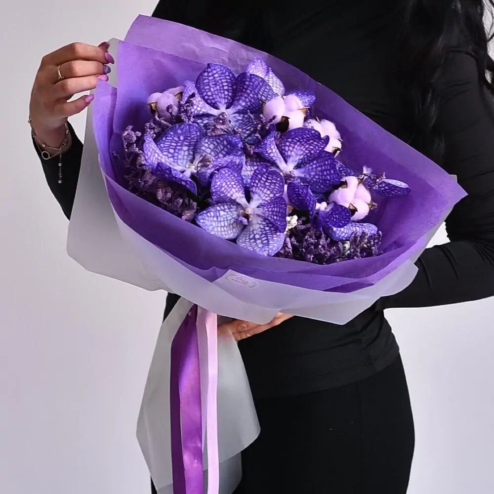 💜 Фиолетовая Магия: Букет из Орхидей Ванда и Хлопка – Очарование в Каждой Детали