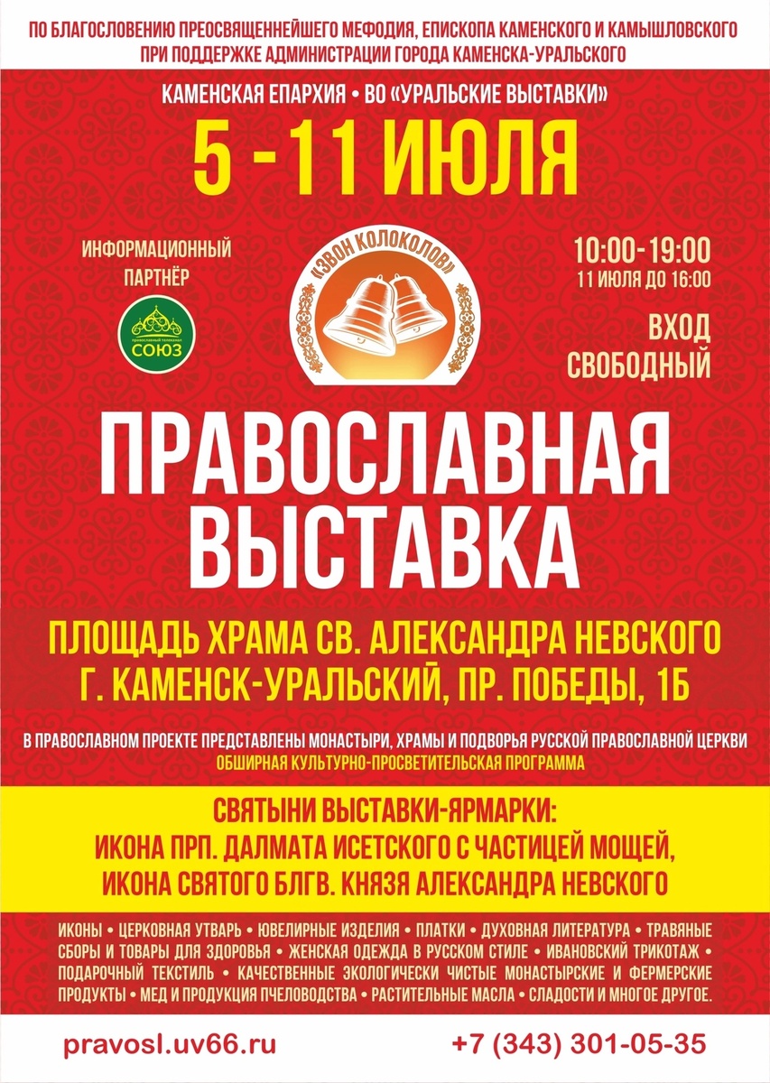 Завтра 5 июля в Каменске-Уральском состоится торжественное открытие православной выставки «Звон колоколов» 🔔. Приглашаем вас в 12:00 к храму святого Александра Невского на молебн. Православная выставка «Звон колоколов» пройдет в Каменске-Уральском по благословению епископа Каменского и Камышловского Мефодия и при поддержке Администрации г. Каменска-Уральского с 5 по 11 июля 2025 г. Каменске-Уральском пройдет ХII Международная православная выставка «Звон колоколов». Организаторы православного проекта: Каменская епархия, выставочное общество «Уральские Выставки» Выставка посвящена: прп. Далмату Исетскому, Дню Каменской епархии и 80-летию Великой Победы. Святынями православного проекта станут: икона прп. Далмата Исетского с частицей мощей и икона св.блгв.кн. Александра Невского. Экспозиционные стенды храмов и монастырей познакомят посетителей выставки, как с историей, так и с современной жизнью святых мест, а также позволят приобрести продукцию, в них изготовляемую. Выставка предста