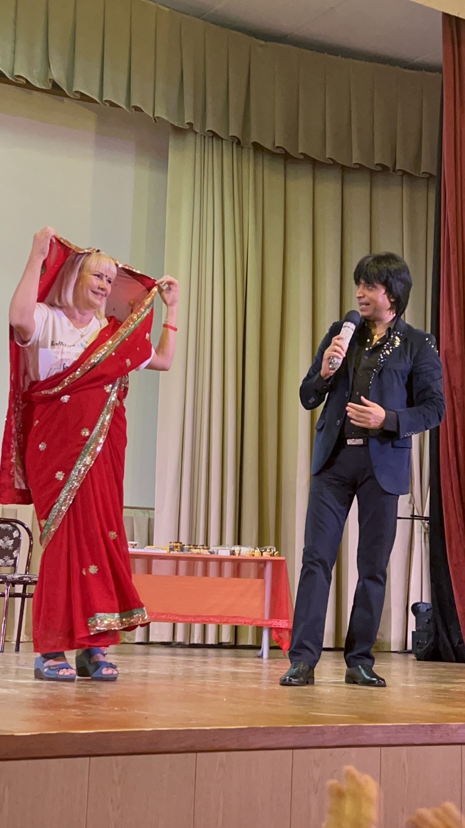 На сцену пригласили одну из зрительниц и вот уже в танце Манишь ее красиво нарядил в сари. Она была очаровательна и красное сари ей, как блондинке, потрясающе шло!
