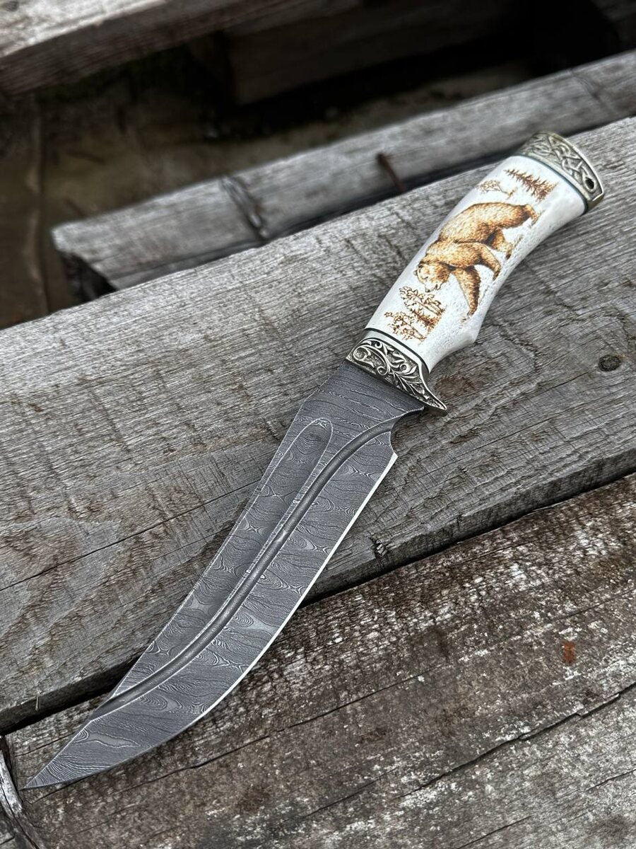 Готов большой рабочий нож «Легионер» – воплощение мощи и изысканности! Перед вами нож, созданный для тех, кто ценит безупречное качество и благородную эстетику. Клинок из 950-слойного дамаска демонстрирует идеальный баланс прочности и режущих свойств. Благодаря специальной обработке сталь обладает исключительной устойчивостью к излому и невероятно долго сохраняет остроту лезвия. Элегантный дол не только придает клинку изысканный вид, но и оптимизирует его вес. Рукоять из натурального рога лося с искусной пирографией в виде медведя обеспечивает надежный хват в любых условиях. Каждый узор на рукояти уникален и выполнен вручную, превращая нож в настоящее произведение искусства. Травмобезопасная гарда из мельхиора добавляет благородный блеск и обеспечивает дополнительную защиту. А бритвенная заточка гарантирует, что нож готов к использованию сразу после приобретения. Этот нож – не просто инструмент, а символ статуса для настоящих ценителей. Охотники, путешественники, коллекци