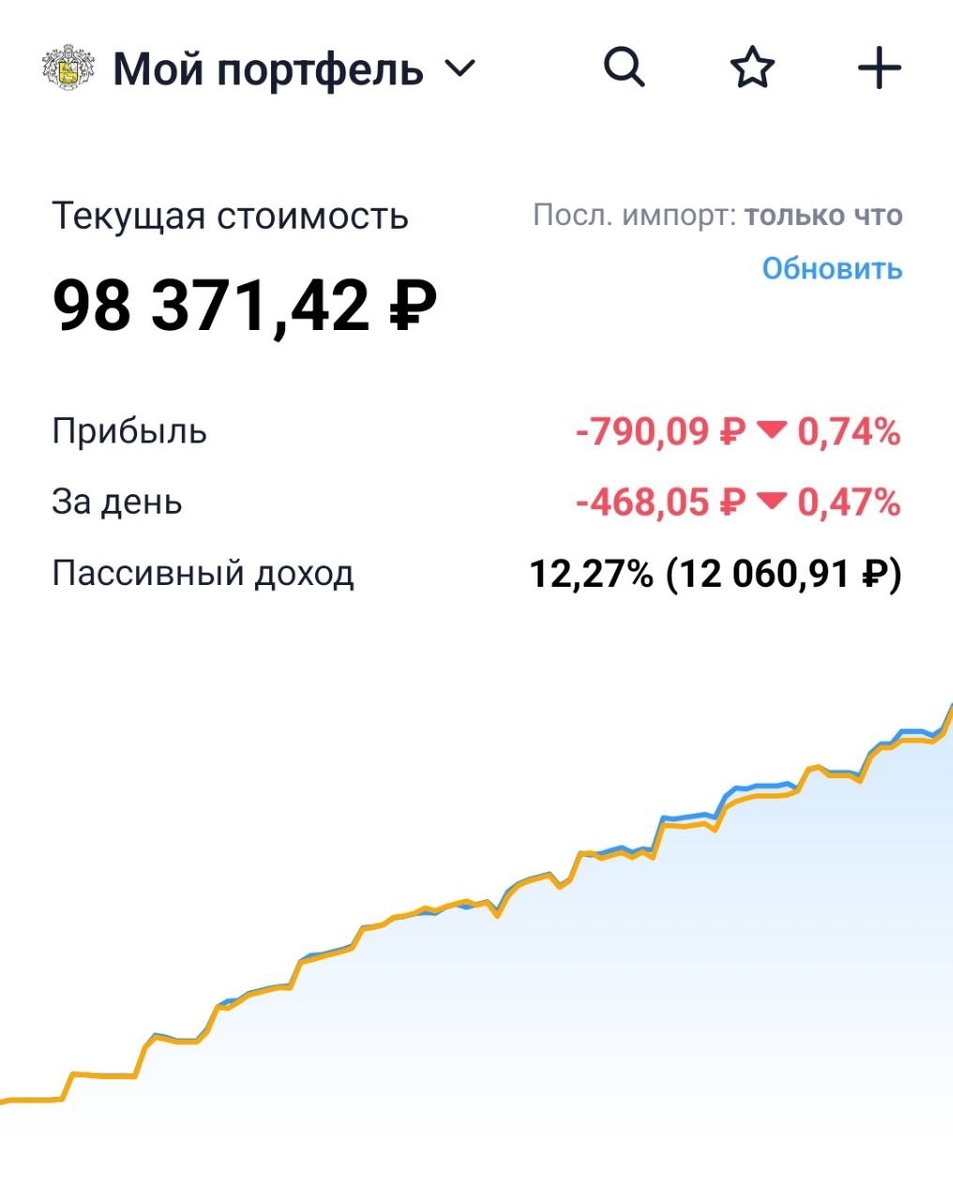 Итак, знакомимся с моим малышом. Всего инвестировано 99161,51 рублей — первые инвестиции были сделаны 18 марта 2025 года. Сделала очередную закупку (на 6,8к), купила: - 10 акций Сбербанк привилегированные SPERP по цене 310,82 ₽; - 10 акций Россети Ленэнерго привилегированные LSNGP по цене 227,45 ₽; - 2 акции НК Роснефть ROSN по цене 452,70 ₽; - 10 акций Сургутнефтегаз привилегированные SNGSP по цене 51,28 ₽. Закупаюсь каждую неделю минимум на 5к. Прямо сейчас портфель оценивается в 98371,42₽, чутка в минусе опять. Самая главная цифра портфеля: за следующие 12 месяцев дивидендами ожидается 12060,91 рублей уже после вычета налогов. Т.е. первый несгораемый косарик уже есть)) Ура! Но и это не важно. Важно, что дивидендами планируется 12,27% к инвестированным мной деньгам. Меня такое устраивает. PS Несгораемый косарик — это стабильный пожизненный ежемесячный доход в размере 1к рублей. И эта тысяча будет индексироваться вслед за инфляцией. Повторили 20 раз — получил пенсию, 100 — приличную з