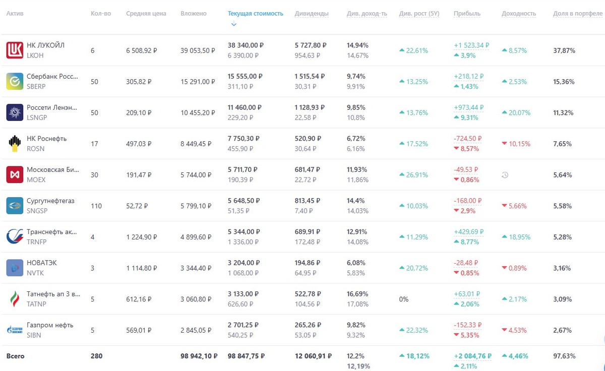 Мой портфель состоит только из тех акций, в которые я верю. Выбираю компании, которые стабильно платят дивиденды и при этом имеют хороший потенциал роста. Считаю дивидендные акции — лучшим из активов. На данный момент у меня в портфеле 10 компаний и пока расширять его не планирую. Сразу обозначу, у меня не диверсифицированный портфель (много нефтянки) — считаю, что до 300к обращать на это внимание не стоит. Тем более во время нынешней распродажи =) Что у меня в портфеле и почему: ✔️ Лукойл LKOH — замена Газпрома)) Если серьезно — чувствует себя отлично, зарабатывает и на экспорте, и внутри страны, платит 10%+ дивидендов к текущей цене. А еще у Лукойла есть денежная подушка, которая уже приближается к впечатляющим 1,5 трлн и находится под процентами. ✔️ Сбербанк пр SBERP — самый крупный банк страны. Стабильно растет год от года и платит дивиденды более 10%. ✔️ Россети Ленэнерго пр LSNGP — очень стабильная компания с постепенно растущими дивидендами. Ситуация примерно как и со Сбером.