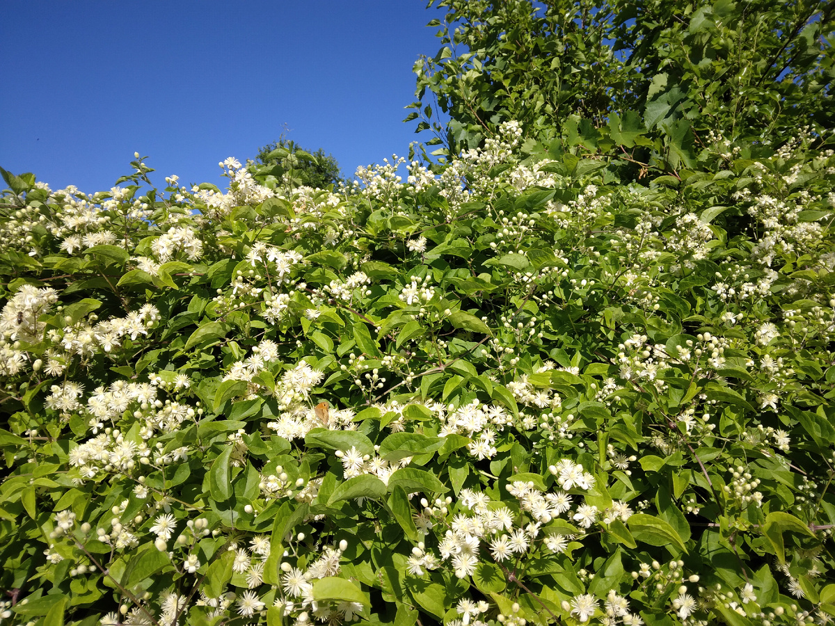Днём опять прижаривает. На следующей неделе обещают до + 38 в тени. Значит, вечерами надо выходить поливать грядки. Собрала урожай чёрной смородины. У меня два взрослых куста, которые в апреле во время цветения попали под снегопад и заморозки. Так что весь урожай выглядит так: Это ещё ничего. На черешнях нынче вообще не было ни одной ягоды. Абрикосовые и персиковые деревья тоже абсолютно пустые, ни одного плода. Год такой. По всей округе бурно цветёт дикий клематис- белыми пушистыми звёздочками. Красивое растение, хотя и считается злостным сорняком. Жёсткое солнце, выжигающее траву, клематису нипочём. Собаки дремлют в тенёчке. Травмированного Тосика я забрала домой и на улицу вывожу утром и вечером. Тосику уже лучше, отёкшая морда приходит в норму, заплывший глаз открылся. Даю ему антибиотики и обезболивающее, Шаро его всё- таки покусал не слабо. Шаро тоже досталось, конечно. Ему я тоже даю доксициклин, для профилактики. К счастью, в ветеринарных аптеках этот препарат продается сво