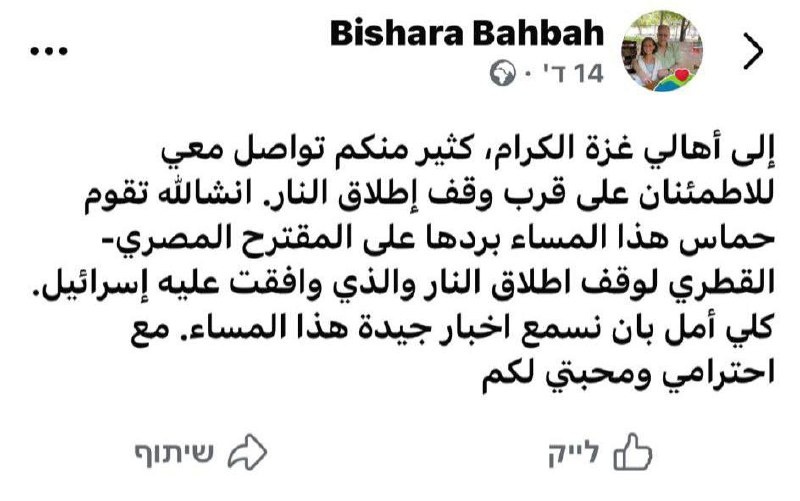 Бишара Бахбах, посланник Трампа и Уиткоффа на переговорах по сделке: “Дорогие жители Газы, многие из вас обратились ко мне с вопросами о прекращении огня. С Божьей помощью, сегодня вечером ХАМАС должен передать свой ответ на египетско-катарское предложение о перемирии, которое уже было одобрено Израилем. Надеюсь, что уже сегодня вечером мы услышим хорошие новости. С уважением и любовью к вам”.