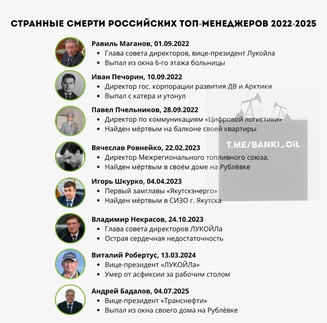 Интересную таблицу представил тг-канал "Баррель черной икры": список почивших топ-менеджеров. Смерти совершенно случайные и неожиданные. В США миллиардеры до 90 доживают, а у нас почему нет? Буквально вчера новое потрясение: не стало вице-президента "Транснефти" - Андрея Бадалова. Выпал из окна своего дома на Рублевке. Вспомнила слова одной писательницы, которую в юности мучила мысль о том, что она никогда не станет знаменитой и богатой, а станет как все. И, подбираясь теперь к почтенному возрасту, она поняла, что быть "как все" - самое лучшее, что может случиться с человеком в жизни. Никто не замечает, никто не завидует. И в голове не цифры, планы и миллионы, а мысль о том, какое сегодня прекрасное небо, какие яркие звезды и какого сочного зеленого цвета листики на на деревьях. Наши люди не боятся жизни, а тем более старости,, они боятся только одного - что на нее может не хватить денег. В молодости можно жить и не замечать недостатков: ну и что, что квартира чужая, ну и что,