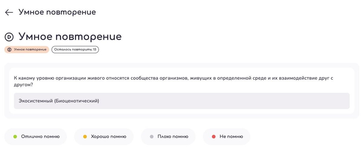 Карточки Умного повторения (УП) ✨ ❤️Науки (разделы биологии): https://neofamily.ru/biologiya/smart-repeat/799173?uuid=566a855d-733e-4bf6-9ec7-f477a4c93bc1 ❤️Свойства живого: https://neofamily.ru/biologiya/smart-repeat/799175?uuid=f71e2c7b-5785-4978-86da-7d8addf23dd2 ❤️Уровни организации: https://neofamily.ru/biologiya/smart-repeat/799178?uuid=c0745485-2e66-4142-997b-f2a215e2540b В карточках — базовая информация с занятия. При желании можно удалять супер-очевидные карточки, либо добавлять свои (по непонятным нюансам) Работает все безумно просто: 1) Добавляете колоду (при желании ее изменяете после добавления) 2) Каждый день в главном меню УП нажимаете зеленую красивую кнопку «Приступить» Вот так просто! Система будет сама определять, какие карточки вам давать на ежедневной основе, а какие реже. Ваши ответы будут прямо влиять на частоту повторения конкретных карточек ❤️ Запомни главное правило — каждый день нажимаем большую красивую зеленую кнопку «Приступить». Каждый день. И с теор