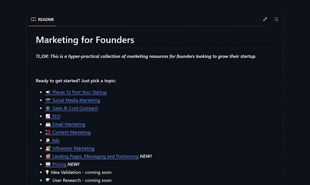 Чел выложил на Reddit пост про то, как стартапам без бюджета, аудитории набрать первых пользователей. Ниже детали... моя адаптация. Он собрал в одном GitHub-репозитории (https://github.com/EdoStra/Marketing-for-Founders) кучу гайдов и советов... Всё разложено по полочкам: от холодных писем до SEO и контент-маркетинга. Есть списки платформ для запуска (вроде ProductHunt и Indie Hackers), советы по соцсетям, холодным рассылкам, созданию лендингов и даже ценообразованию. Надеюсь вам будет полезно, я сохранил в закладках... Надеюсь когда-то выйдем на западные рынки. Русский ИТ бизнес