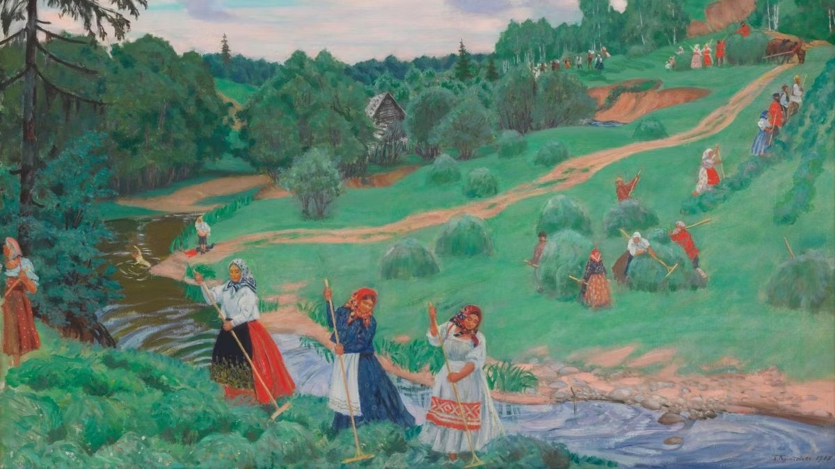 Кустодиев писал не пейзажи, а скорее видение, внутренний пейзаж. Своей грезой он создал свое пространство между реальной Россией и внутренней — страну «Кустодию», которую он материализовал на холсте.