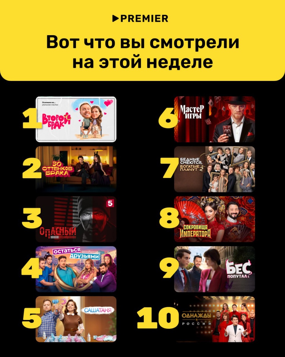 В топе PREMIER на этой неделе сразу два брака, и оба — ну очень запоминающиеся 🌝 Какой выбираете? ❤️ — «Второй брак» 🫶 — «50 оттенков брака» ⚡️ Смотрите всё лето за 99 ₽/мес