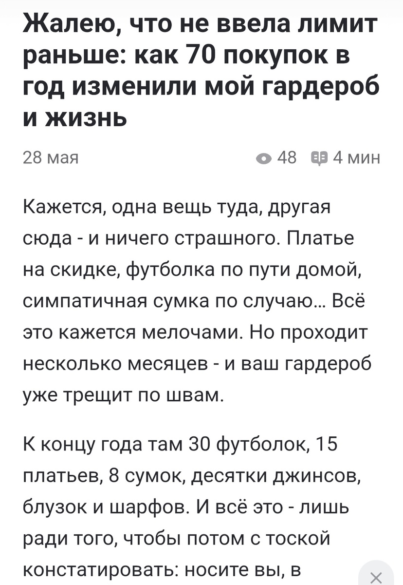 На днях наткнулась в Дзене на статью одного автора, которая ссылалась на другого автора и та в свою очередь ссылалась на третьего автора... и все они ссылались на новомодную Теорию покупок семидесяти вещей в год.
