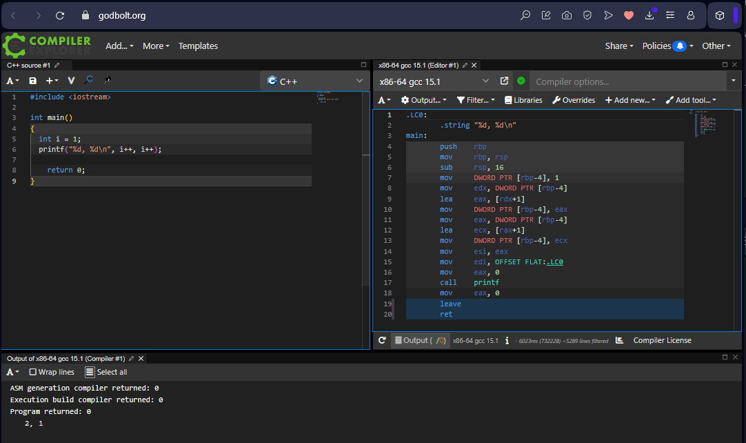 } Вопрос простой, что будет выведено в результате работы программы? printf является функцией, соответственно очередность выполнения выражений в аргументах не определена, можно получить результат: 1, 2 или 2, 1 и даже 1, 1 Этот эксперимент можно повторить на платформе https://godbolt.org Результат 2, 1 Результат 1, 2 Причем будет выдано предупреждение: warning: multiple unsequenced modifications to 'i' [-Wunsequenced] -Wunsequenced - возникает, когда в одном выражении происходит несколько изменений одной и той же переменной, причем порядок их выполнения не определен. В C/C++ стандарт не гарантирует, в каком порядке будут вычисляться такие операции, что может привести к неожиданным результатам. Получи