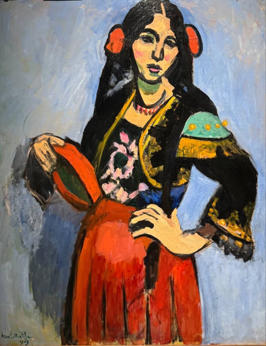Картина «Испанка с бубном» (1909) Анри Матисса. Она не была испанкой — по одним источникам, цыганка, по другим — итальянка. Но художник сам создаёт её образ: пестрая блуза, вышивка, бубен. Как думаете, удался образ? Этот портрет — часть цикла, где Матисс писал сильных женщин без кокетства и позёрства. Темные контуры, резкие цвета, пронизывающий взгляд — за это его и критиковали… А вас пугает эта женщина? Что чувствуете глядя на нее? Сегодня эта картина на выставке в музее русского импрессионизма «Русские дикие». Нашла эту картину на Яндексе за 1500 р )))
