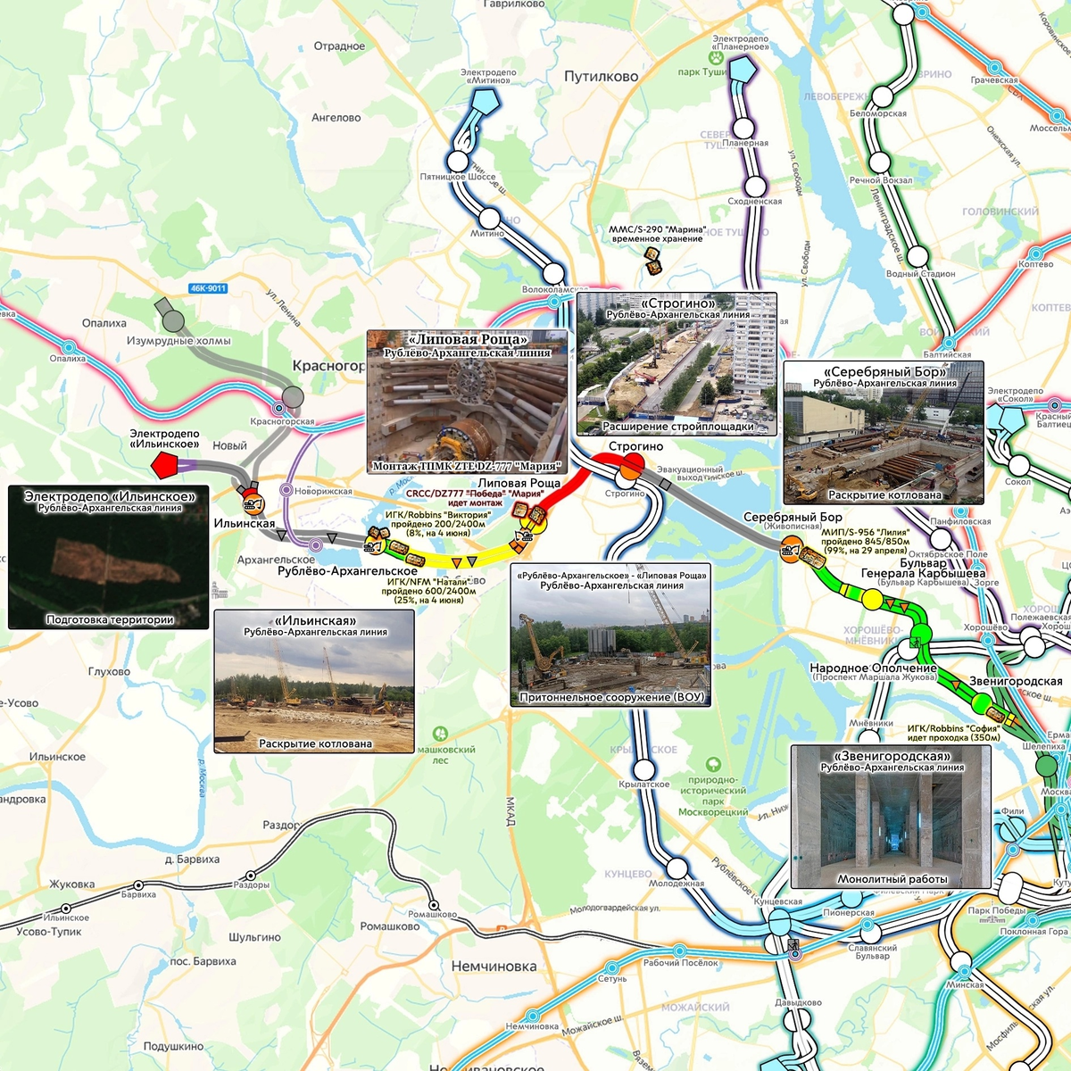Мы продолжаем рассказывать о ходе строительства московского метрополитена. Нанесли на нашу схему развития метро все основные изменения за июнь 2025 года. Версия от 03.07.2025. 1) ⬅️Западный сектор, 💸Рублёво-Архангельская линия: - 🏗 Завершены монолитные работы в платформенной части «Звенигородской»; - 🚜 Продолжается раскрытие котлована станции «Серебряный Бор»; - 🚧 Состоялось перекрытие Строгинского бульвара, стройплощадка станции «Строгино» наконец-то расширена до проектных размеров; - ⚙ На «Липовой Роще» ведётся монтаж ТПМК ZTE DZ-777 "Мария" (ранее - "Победа") для дальнейшей проходки двухпутного тоннеля до «Строгино». Завершено раскрытие котлована платформенной части станции, продолжается раскрытие котлована оборотных тупиков; - 🚜 Приступили к сооружению стены в грунте для котлована притоннельного сооружения (водоотливная установка) перегона «Рублёво-Архангельское» - «Липовая Роща»; - 🚜 На «Ильинской» приступили к раскрытию котлована; - 🌲🚜 На территории, выделенной под электр