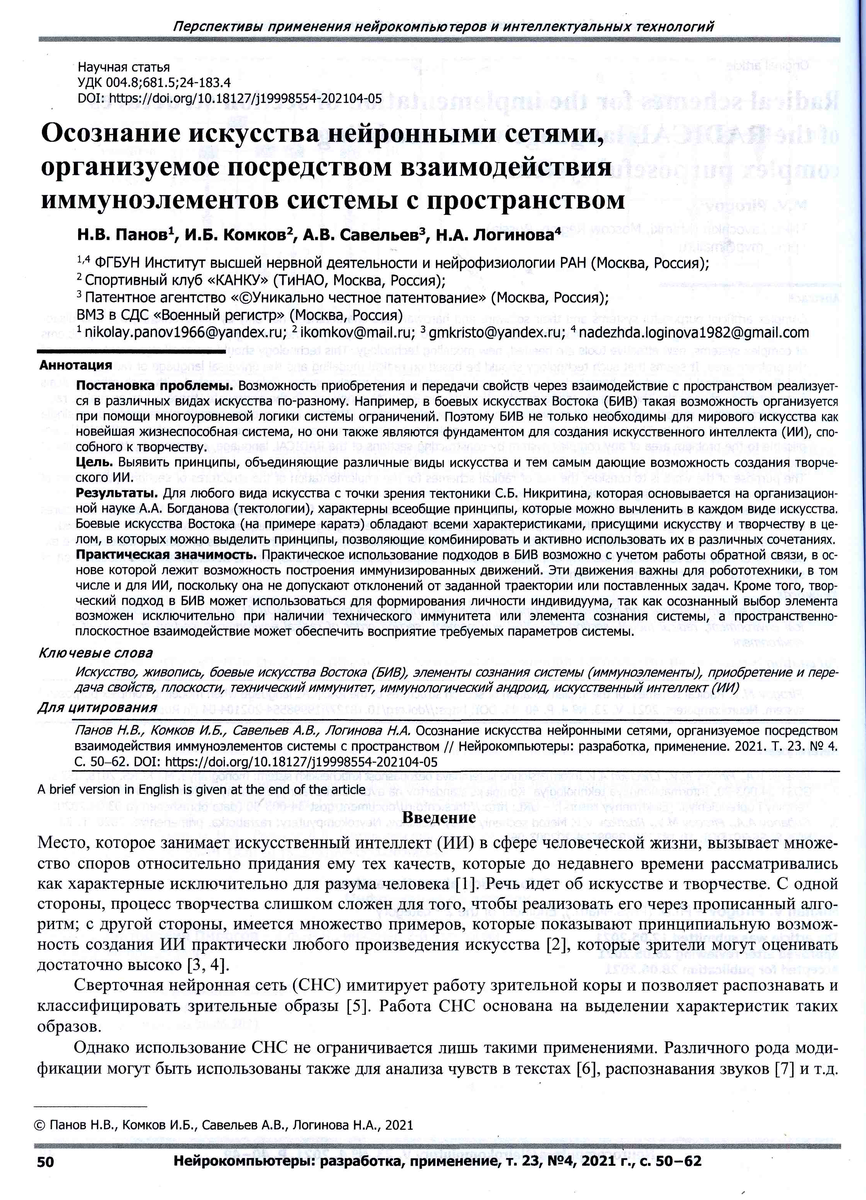 Осознание искусства нейронными сетями, организуемое посредством взаимодействия иммуноэлементов системы с пространством