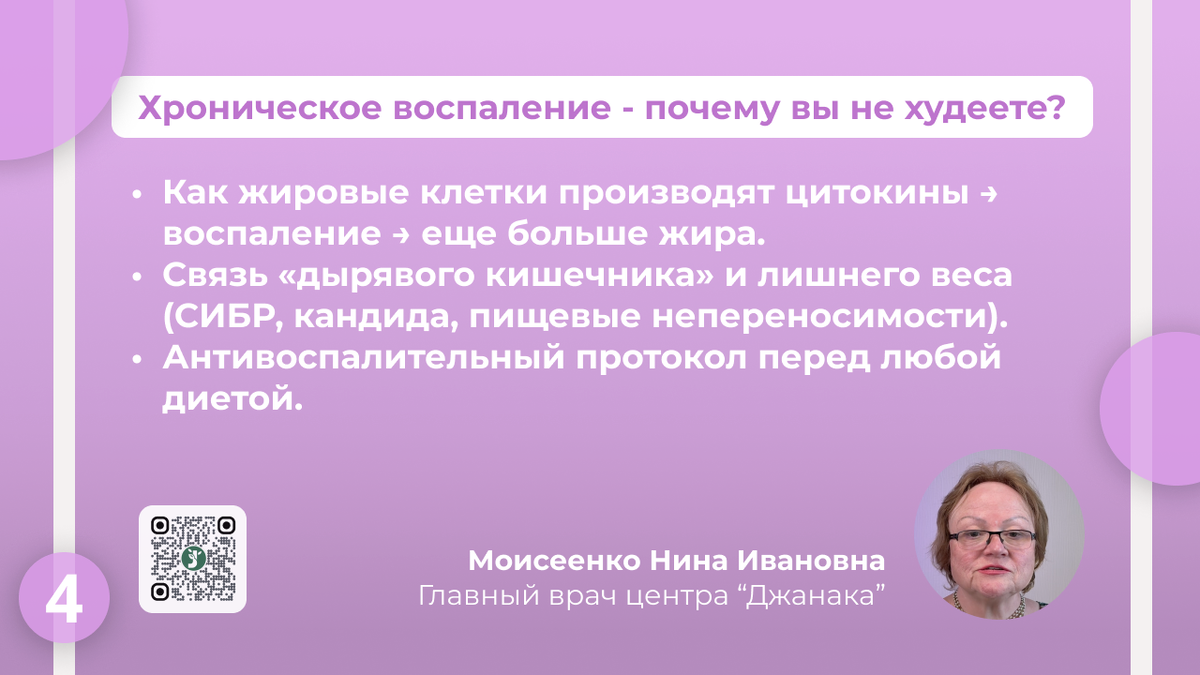Дорогие друзья! Сегодня мы разберём коварную причину лишнего веса, о которой мало кто знает — хроническое воспаление. Готовы узнать, как жировые клетки сами создают условия для своего роста? Жир = фабрика воспаления. 🔬 Научный факт: Жировая ткань — это не просто «запас энергии». Это активный эндокринный орган, который: ✔ Вырабатывает провоспалительные цитокины (IL-6, TNF-α) ✔ Создает окислительный стресс ✔ Вызывает инсулинорезистентность Результат - чем больше жира → тем сильнее воспаление → тем сложнее его сжечь. Порочный круг - воспаление → лишний вес → воспаление. 1️⃣ Жировые клетки выделяют цитокины 2️⃣ Иммунная система реагирует на них как на угрозу 3️⃣ Организм замедляет метаболизм, чтобы «экономить энергию» 4️⃣ Вы не худеете, даже на дефиците калорий Пример из практики: «У пациентка 38 лет постепенно нарастает вес, несмотря на правильное питание + спорт, периодически садится на диеты, считает калории, но вес не уходит. Анализы показали высокий С-реактивный белок (маркер воспале