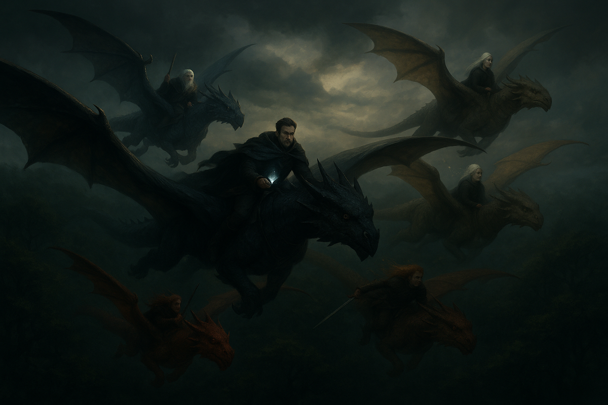 Пять драконов неслись над нескончаемым морем зелени, оставляя позади Тёмный Лес с его загадками и насмешками. Лес не хотел выдавать тайны, но Эльридан верил: это лишь отсрочка неизбежного. Впереди, на горизонте, занимался багрянец заката, кроваво-красный свет окрасил разорванные облака. Всадники возвращались молча, понуро опустив головы: каждый переживал неудачу в тишине. Даже пылкий Райнар сейчас кусал губы, удерживая гнев при себе. Лишь шелест крыльев да редкое тяжёлое дыхание драконов нарушали безмолвие.