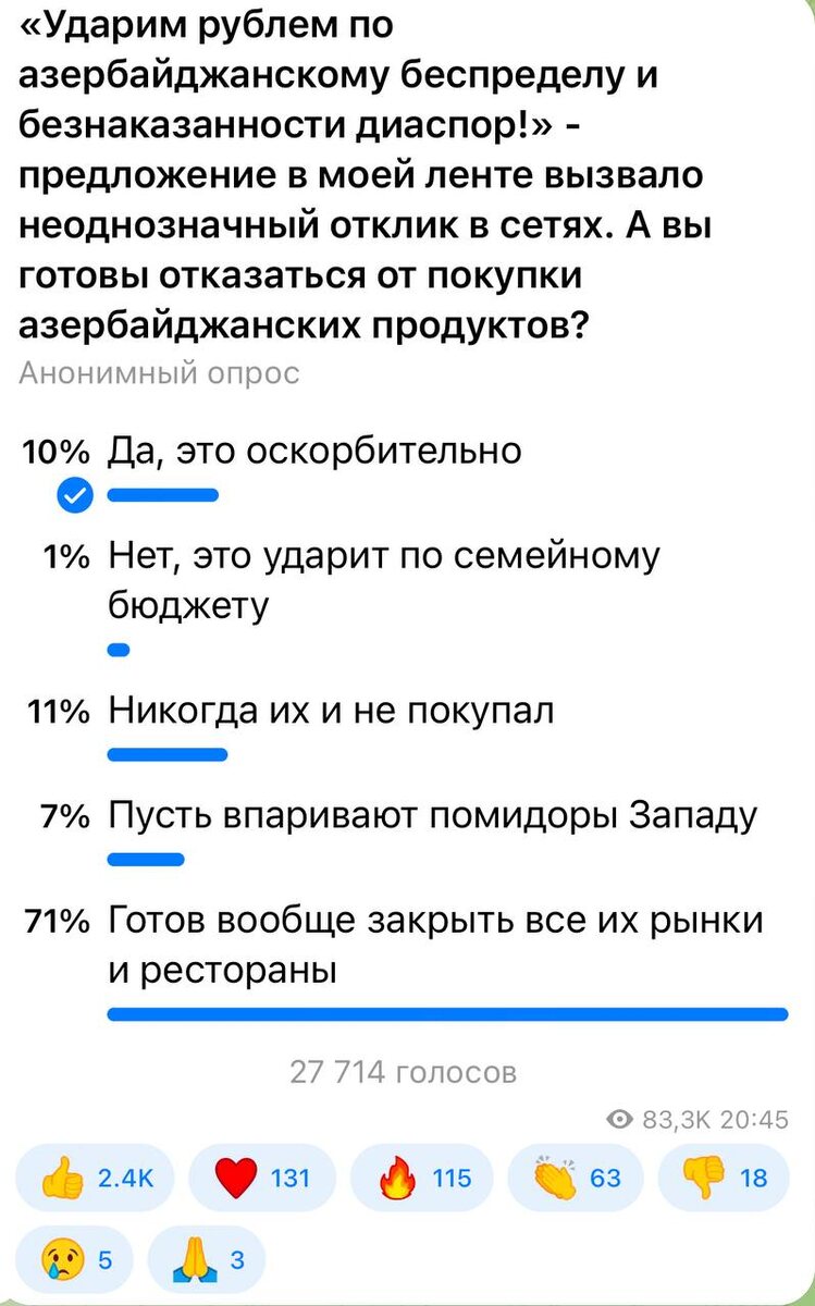 ⚡️⚡️⚡️ 71 процент проголосовавших готовы закрыть вообще все азербайджанские рынки и рестораны. Удар по кошельку всегда эффективнее дипломатической истерики, которую устроил официальный Баку.