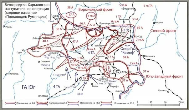 В ходе наступления наши 40-я и 27-я армии Воронежского фронта 11 августа перерезали железную дорогу Харьков-Полтава, в то время как войска Степного фронта подошли к Харьковскому оборонительному обводу на 8-11 километров. Пытаясь остановить наше наступление, немецкое командование перебрасывает четыре танковые дивизий из Донбасса.