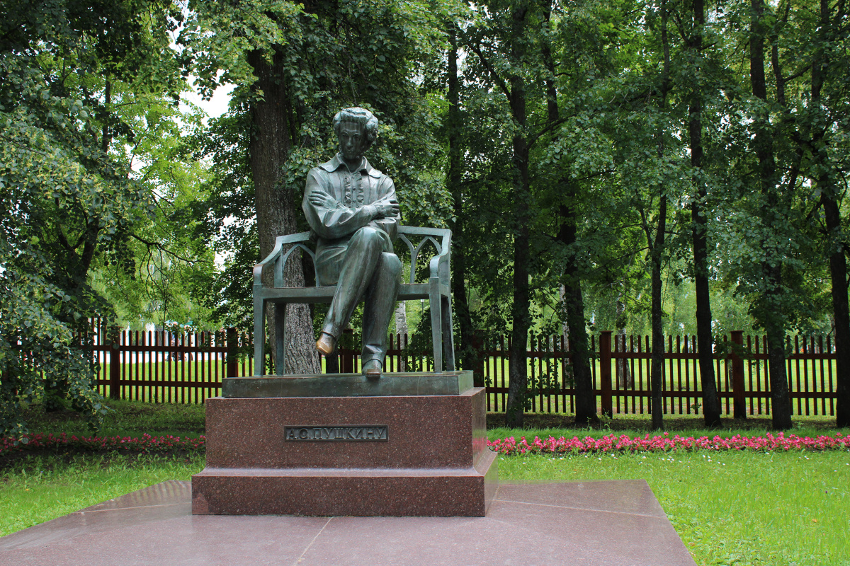 Обычно везде показывают скульптуру 1979 года (она в шапке заметки) Олега Комова — Александр Сергеевич сидит на скамейке у барского дома.